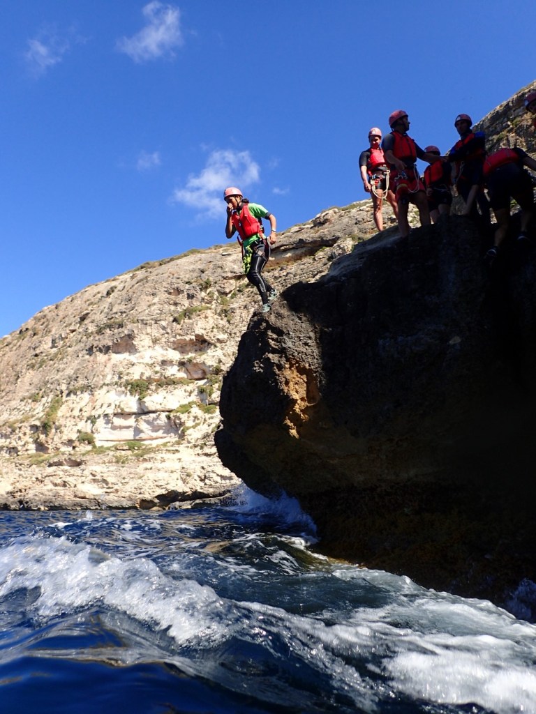 Na een korte ochtendwandeling door het natuurreservaat Majjistral Nature and History Park starten we ‘s middags met het echte werk. Coasteering – what’s in a name? Loodrechte kliffen, helm op, reddingsvest, klimgordel en musketons. Klimervaring is geen must, al laat je hoogtevrees best thuis. Op de rand van een klif met zicht op zee, da’s onze afspraakplek met Charlie en Bogdan “but you can call me Bob”. Bob ziet er niet echt serieus uit. Noem me ouderwets, maar bij een nektattoo heb ik mijn bedenkingen… Het tegendeel van mijn conservatieve ideeën blijkt: Bob is heel ernstig als het over zijn coasteering-klimbusiness gaat. Het is dan ook geen activiteit voor watjes. We begeven ons op een zeer smal en zanderig richeltje. Complete concentratie vereist. Ver onder ons schittert de Middellandse Zee in de zon.